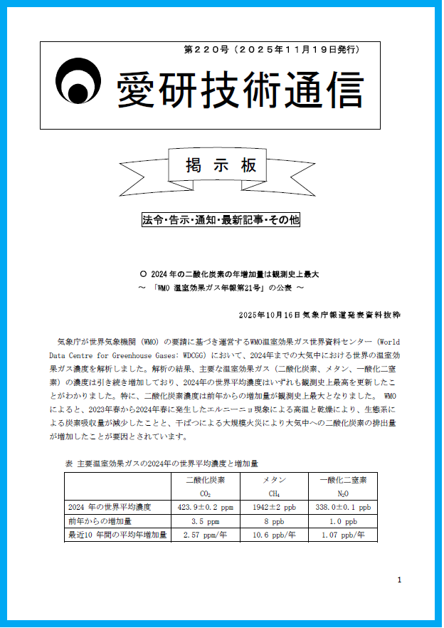 2006年12月より愛研の社内向けに発行している、「愛研技術通信」をPDFファイルとして公開しています。環境調査や分析の仕事をしていく上で「ためになる」情報、息抜きになる情報のほかに、愛研についてもっと知って頂ける情報も満載です。「愛研技術通信」は、月に一度、発行しております。