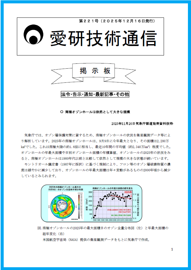 2006年12月より愛研の社内向けに発行している、「愛研技術通信」をPDFファイルとして公開しています。環境調査や分析の仕事をしていく上で「ためになる」情報、息抜きになる情報のほかに、愛研についてもっと知って頂ける情報も満載です。「愛研技術通信」は、月に一度、発行しております。